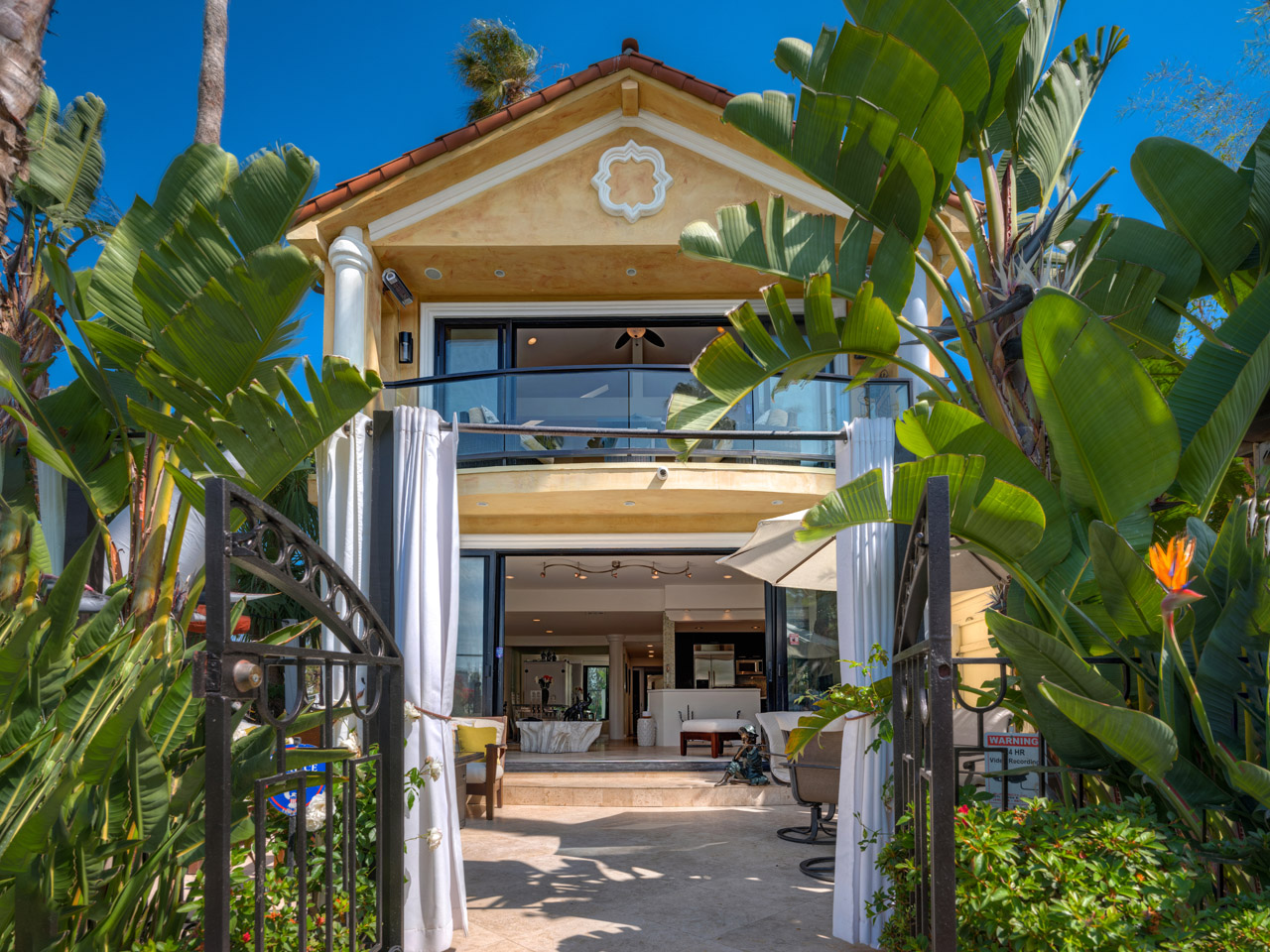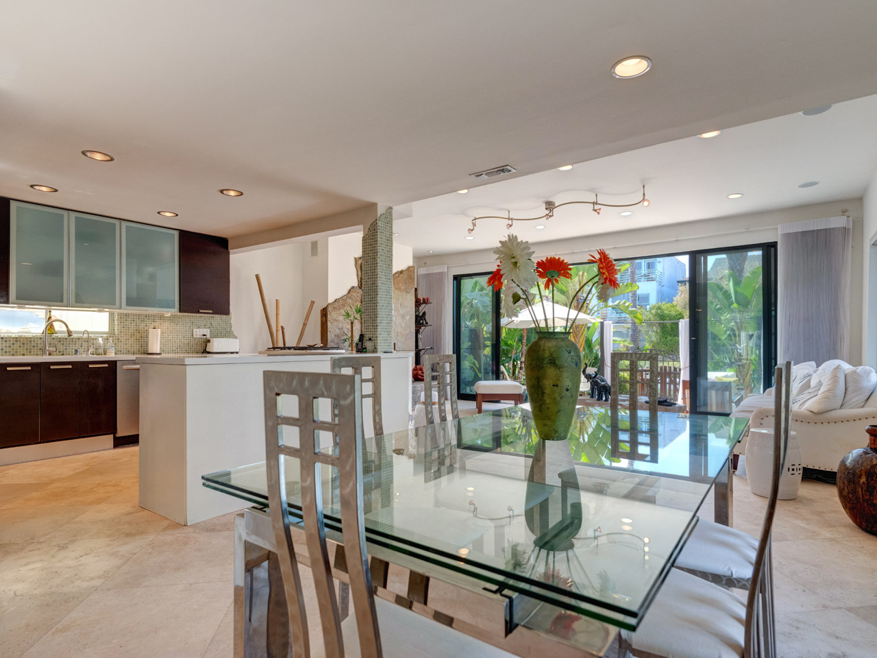 10 ft sliding doors leading to waterfront patio . water front dining area