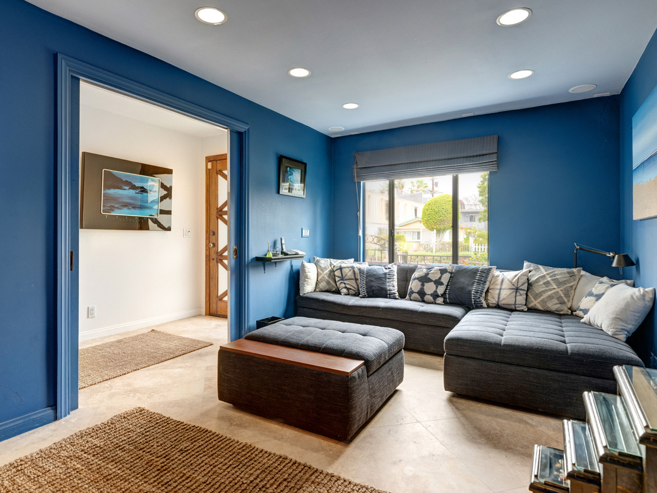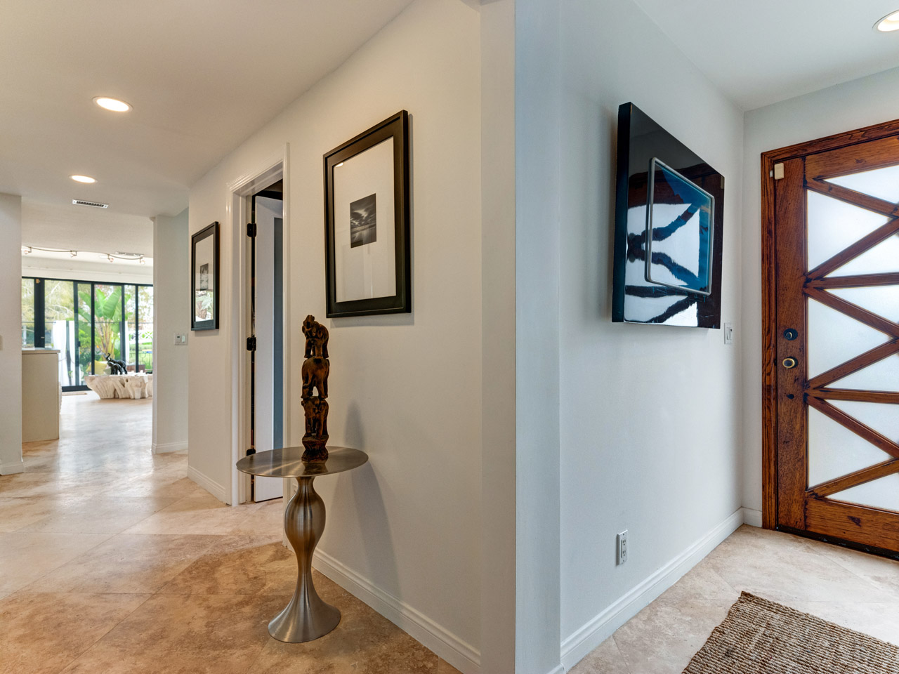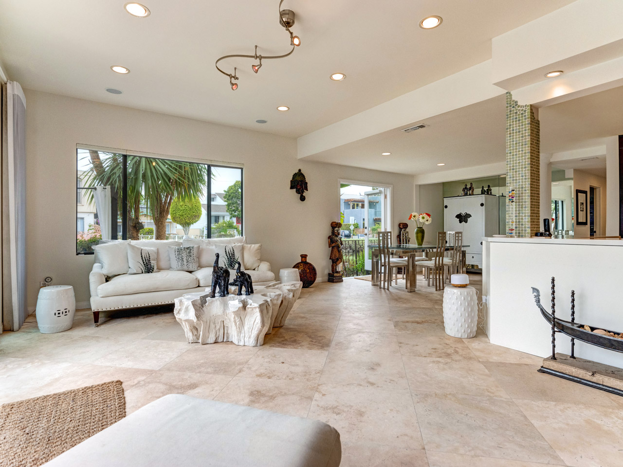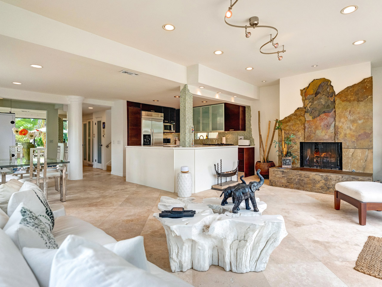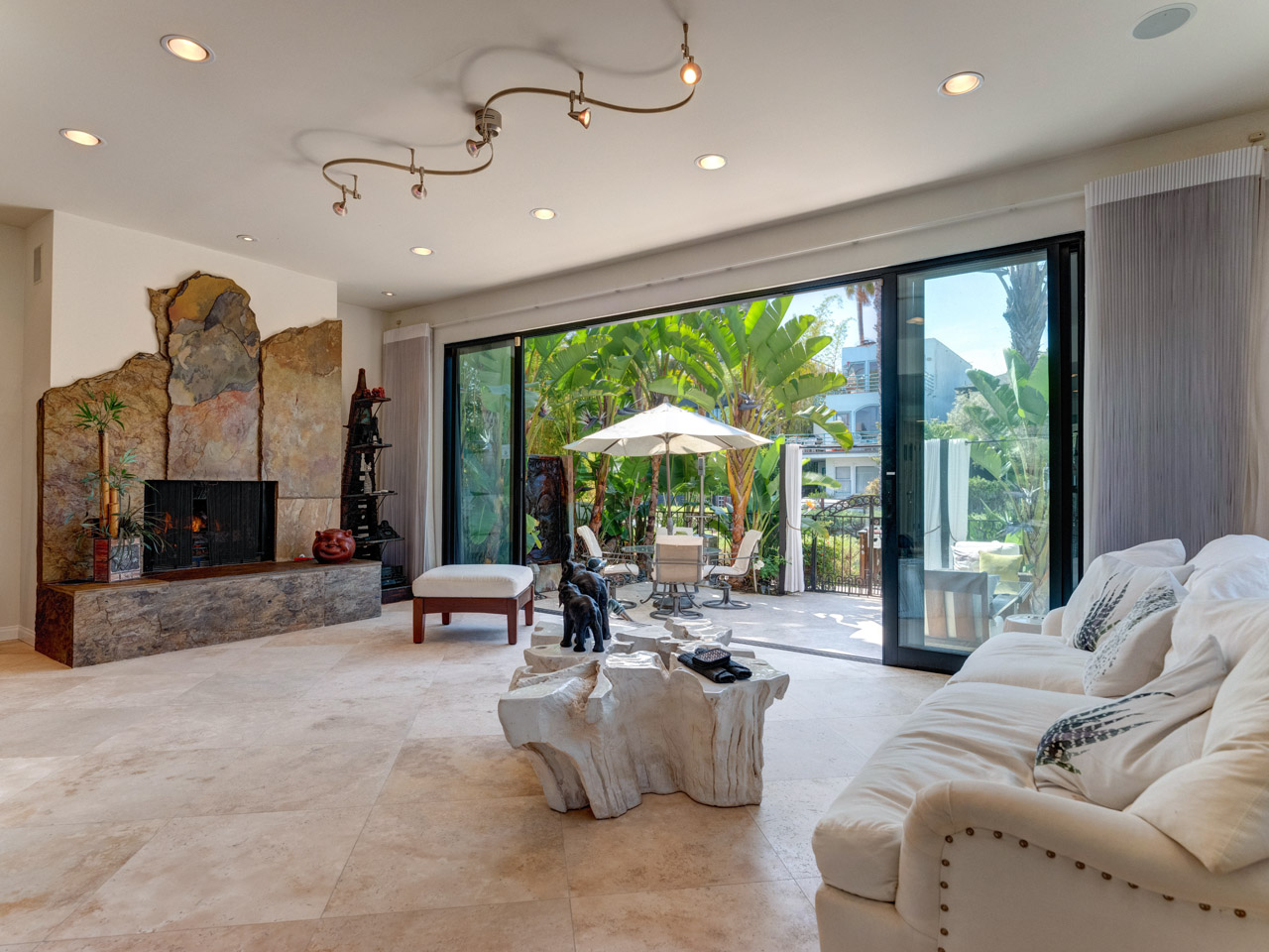Living room with custom stone fireplace and travertine floors.