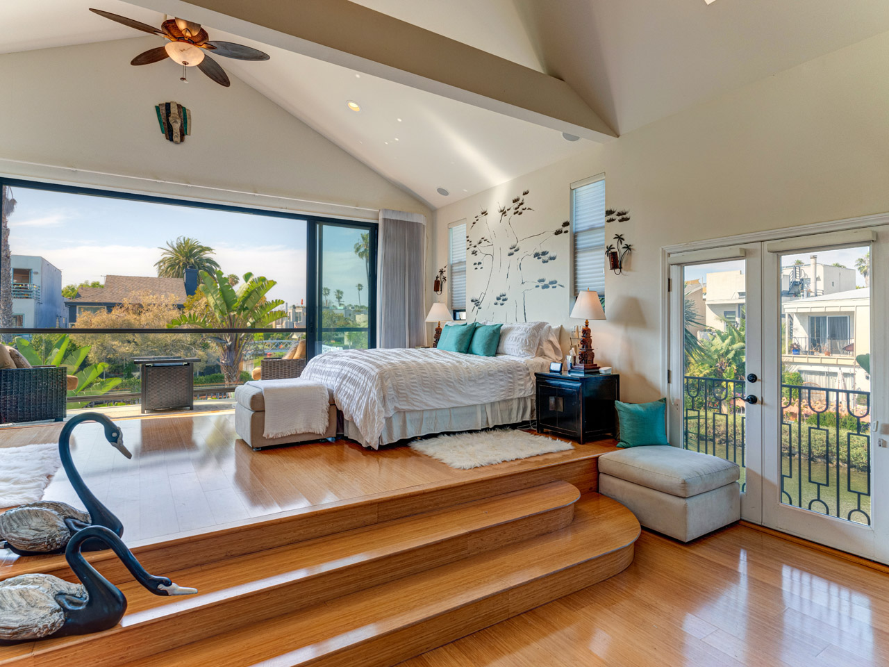 2nd bedroom with 12 ft ceilings and French doors opening to the water with its own redesigned bathroom with duel sinks and white porcelain floor.