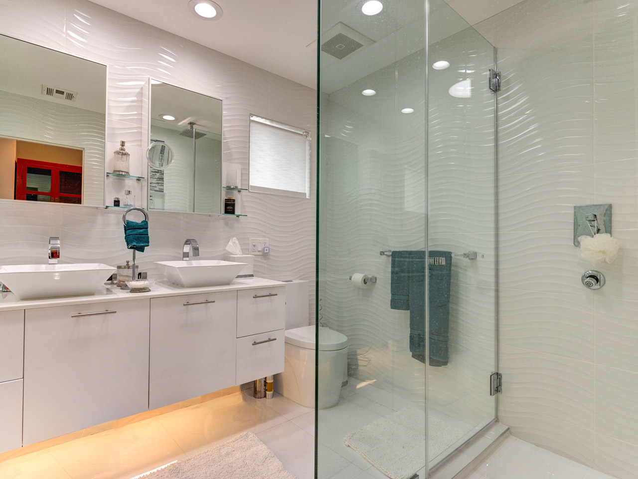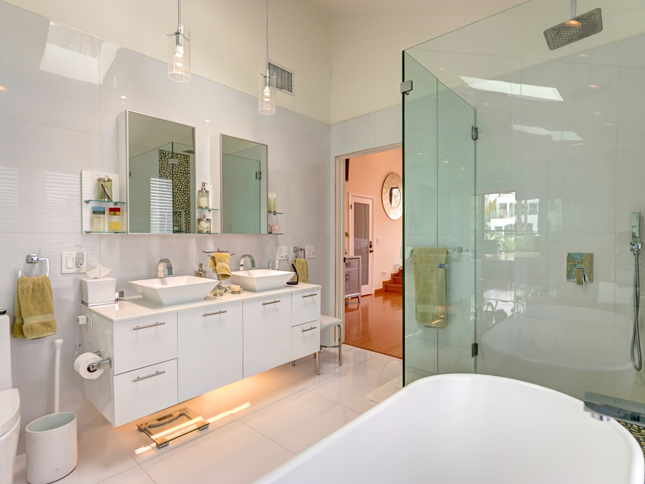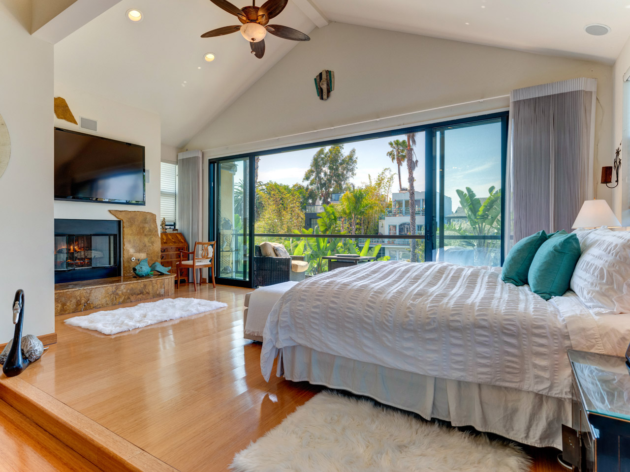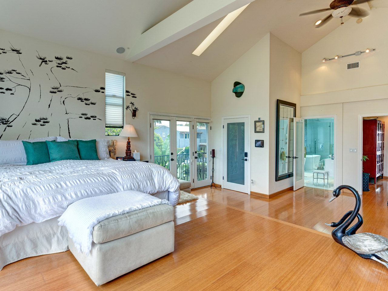 Huge Master bedroom with 20 ft high ceilings 10 ft doors sliding leading to glass balcony, custom stone fireplace ,two walk in closets ,bamboo floors throughout second level, redesigned master bathroom with white porcelain floors and water views,